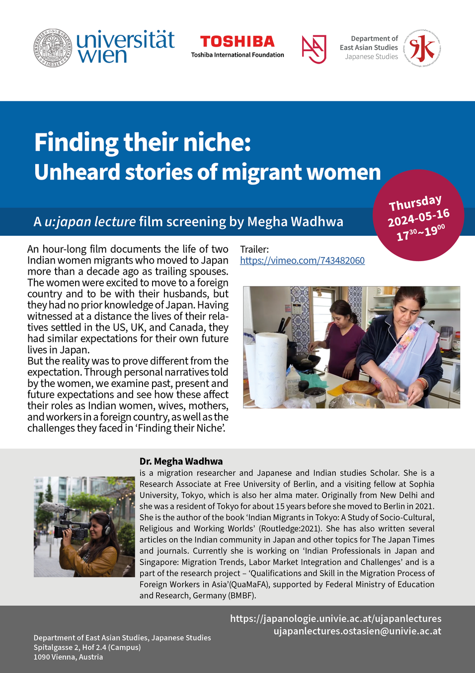 An hour-long film documents the life of two Indian women migrants who moved to Japan more than a decade ago as trailing spouses. The women were excited to move to a foreign country and to be with their husbands, but they had no prior knowledge of Japan. Having witnessed at a distance the lives of their relatives settled in the US, UK, and Canada, they had similar expectations for their own future lives in Japan. But the reality was to prove different from the expectation. Through personal narratives told by the women, we examine past, present and future expectations and see how these affect their roles as Indian women, wives, mothers, and workers in a foreign country, as well as the challenges they faced in ‘Finding their Niche’.